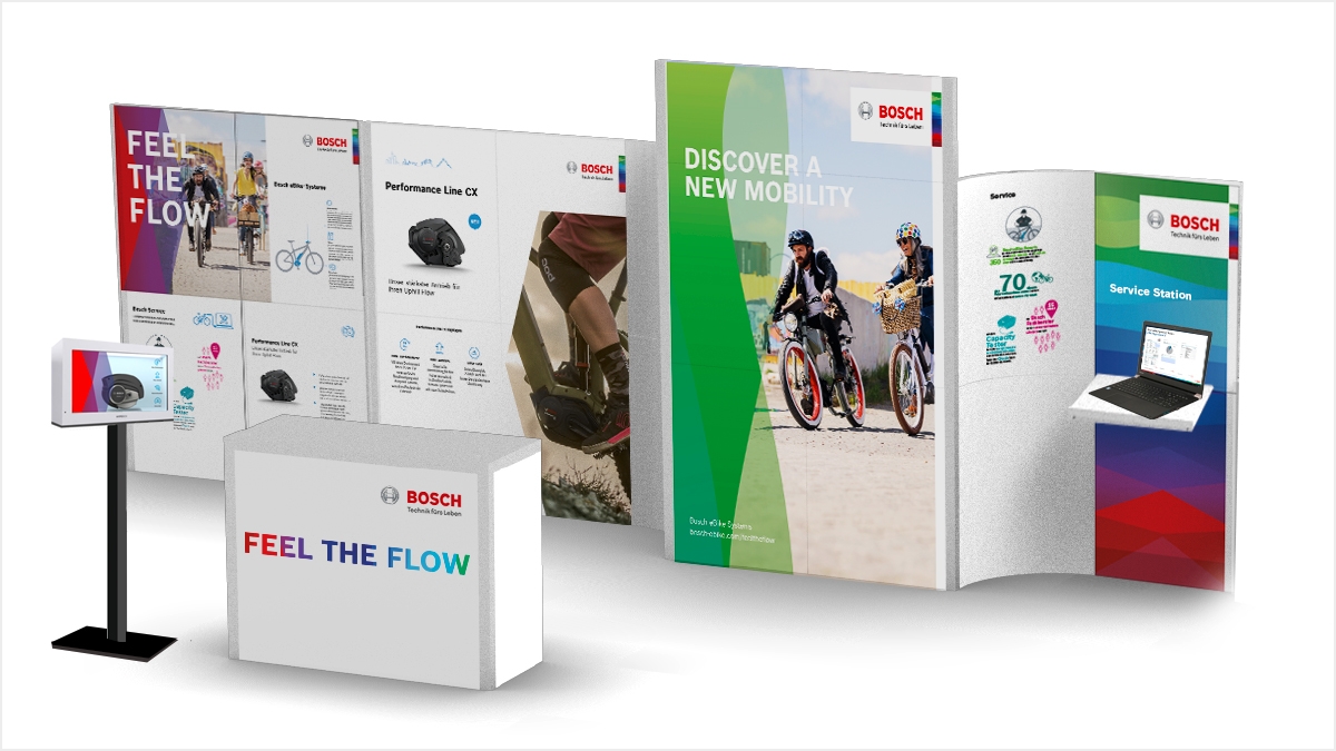 Feel the Flow. Mit einem abgestimmten Maßnahmenbündel unterstützen wir Bosch eBike Systems dabei, seine Position als führender Komponentenhersteller im boomenden Pedelec-Markt auszubauen. Neben der Überarbeitung und Neugestaltung des umfangreichen Produktkatalogs haben wir ein neues Konzept für einen intuitiveren Akku-Guide sowie das Logo zum 10-jährigen Firmenjubiläum entwickelt. Großen Zuspruch beim Vertrieb fand unser modulares, wiederverwendbares Standkonzept für interne Messen.