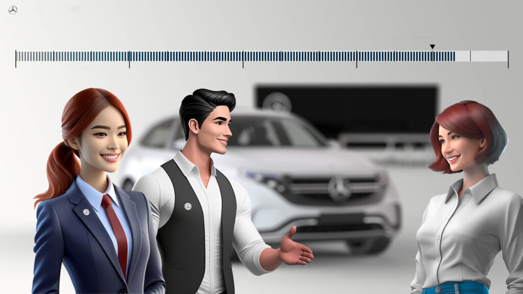 Mithilfe einer interaktiven PowerPoint-Präsentation wurden Mercedes-Benz Mitarbeiter:innen in 10 Kapiteln für den optimalen Verkaufsprozess geschult. Mit den hierfür entwickelten Charakteren wurde für jeden der 10 Prozessschritte ein animiertes Video generiert, das in der Erstellung nicht aufwendiger, in der Darstellung aber sehr viel attraktiver und kurzweiliger ist als die Präsentation. Dabei wurden alle Charaktere, alle Symbole, alle Szenen und auch die Sprecher:innen mit der KI generiert – und von uns geschnitten und gesteuert. Hier eine Zusammenstellung der wesentlichen Gestaltungselemente.